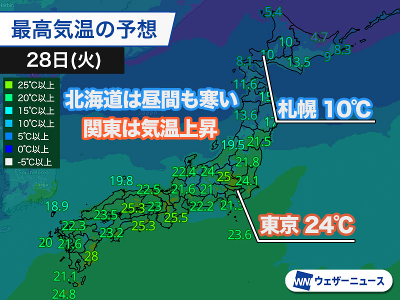 今日の北海道は冬物が活躍する寒さ 関東は気温上昇