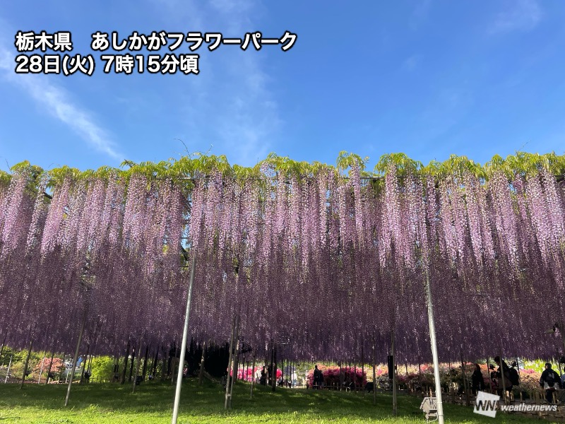 今日28日(火)の栃木県は穏やかに晴れて、青空のもと満開の藤を楽しめそうです。暑さと紫外線にはご注意ください。