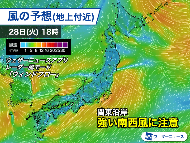 夕方以降は南西風がさらに強まるため、飛来物や交通機関への影響に注意してください。