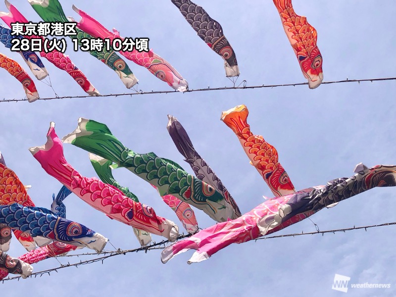 今日28日(火)は北日本から西日本にかけて、沿岸部を中心に風が強く吹いています。関東は東京湾周辺で南風が強く、鯉のぼりは元気が良すぎるくらいです。