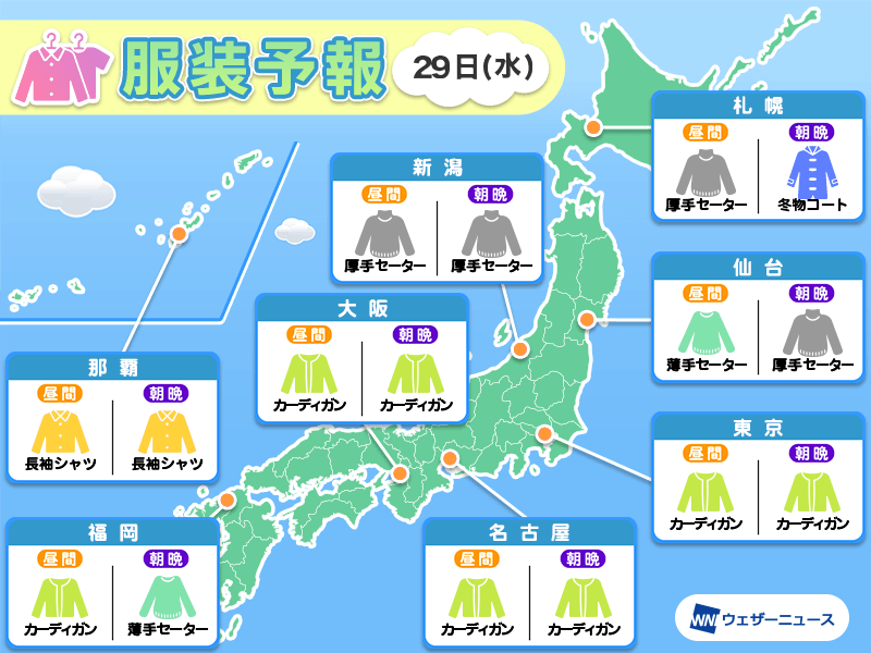4月29日(水) 各地の気温変化と最適な服装