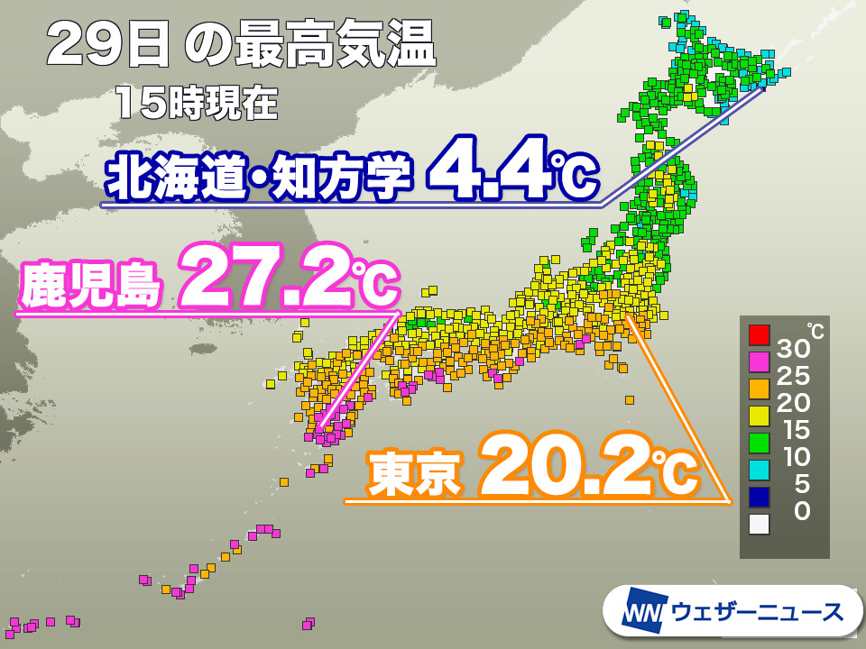 今日29日(水)は本州を広く雲が覆いましたが、東海や西日本太平洋側では日差しが届く時間帯があり、夏日となった地点も日差しが届いた地点と概ね近くなっています。