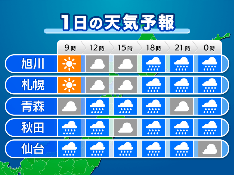 低気圧や前線が接近する北日本はだんだんと本降りの雨の範囲が広がります。朝のうちまだ雨の弱い東北南部もだんだん雨が強まり、まだ晴れている北海道も午後は雨の範囲が拡大します。傘を持ってお出かけください。