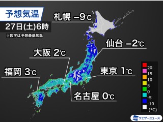 気温が低いため洗濯物の乾きが非常に遅く、凍結のリスクもあります。外干しは難しい予想です。