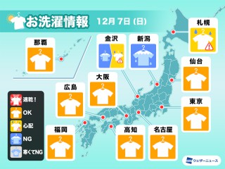 気温が低いため洗濯物の乾きが非常に遅く、凍結のリスクもあります。外干しは難しい予想です。