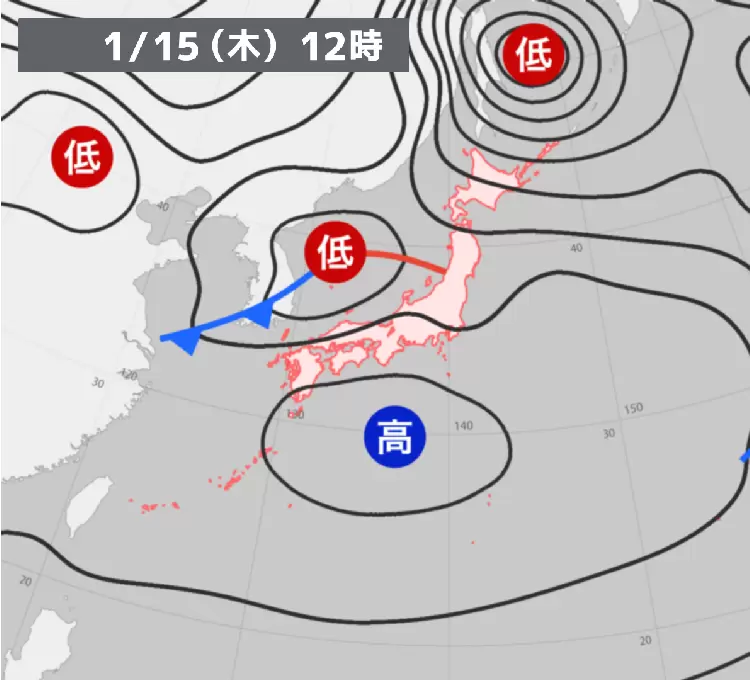 前線を伴った低気圧が日本海を東進し、北日本や西日本の日本海側を中心に雪や雨が降っているところがある。前線や低気圧近傍での雪や雨の強まりに注意が必要だ。一方、高気圧圏内の太平洋側は広く晴れている。