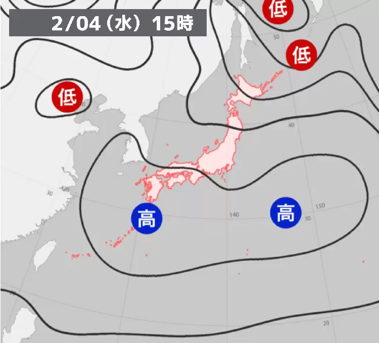 日本付近は高気圧圏内で、晴れているところが多い。ただ、北日本の一部には異なる風のぶつかり合いによって発生した雲が発生。雨や雪が降っているところがある。