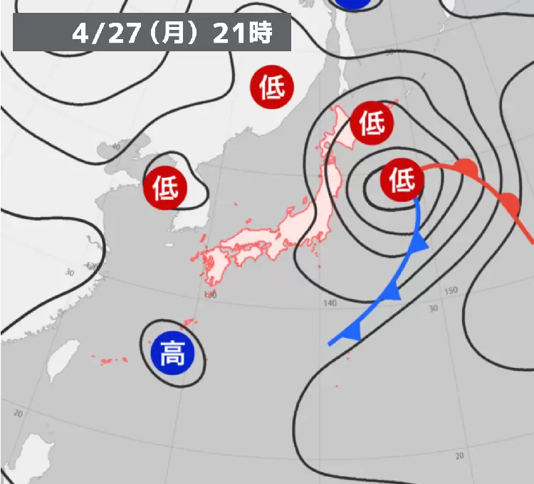 前線を伴った低気圧が本州南岸を東進し日本の東海上へ。南西諸島付近に中心を持つ高気圧に覆われてきた。全国的に天気の大きな崩れはない。