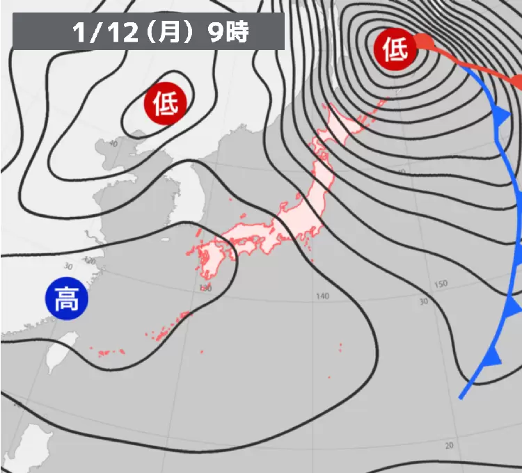 日本付近は強い冬型の気圧配置となっている。日本海側を中心に雪が降り、大雪や吹雪による視界不良、積雪の急増に警戒が必要だ。雪雲は太平洋側にも流れ込み、一部で雪の降っているところがある。また等圧線の間隔は狭く、全国的に強風や暴風にも注意が必要だ。