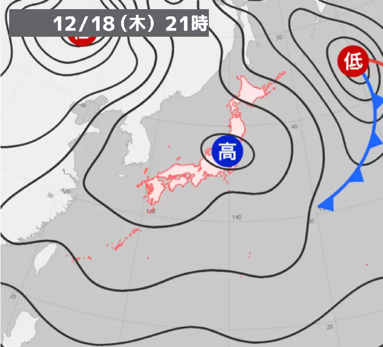 日本付近は高気圧に覆われて、晴れているところが多くなっている。上空の寒気の影響で北海道では雪が降っているところがあるが、段々と止むエリアが増えてきている。