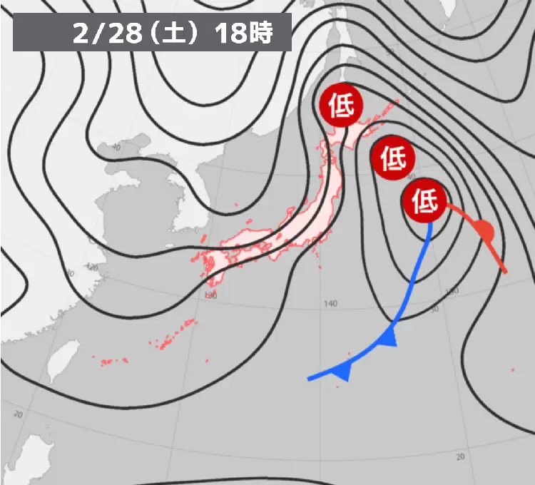 低気圧は東に進み、日本列島は西高東低(冬型)の気圧配置になっている。日本海側の地域では雲が多く、太平洋側の地域では晴れている。また、等圧線の間隔が狭いため、引き続き風が強く吹いている。特に北日本は強風に注意が必要だ。
