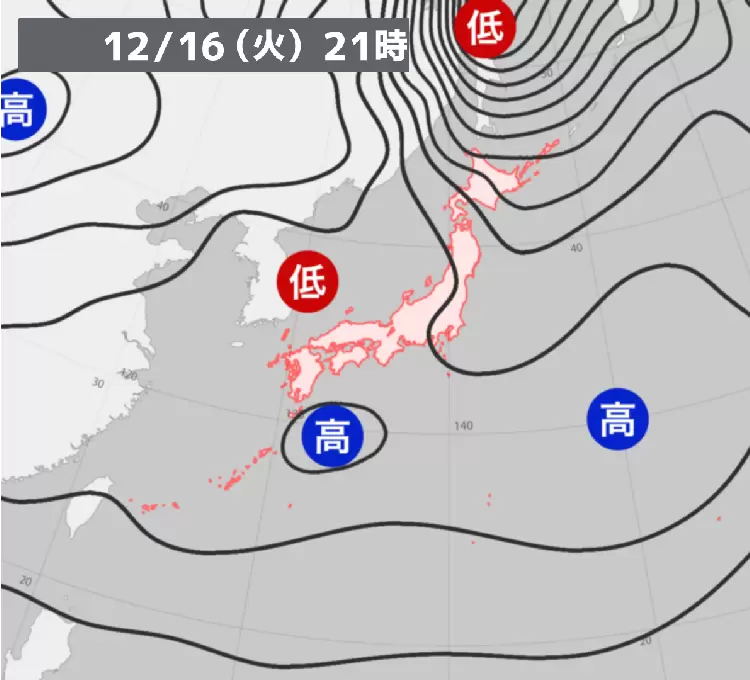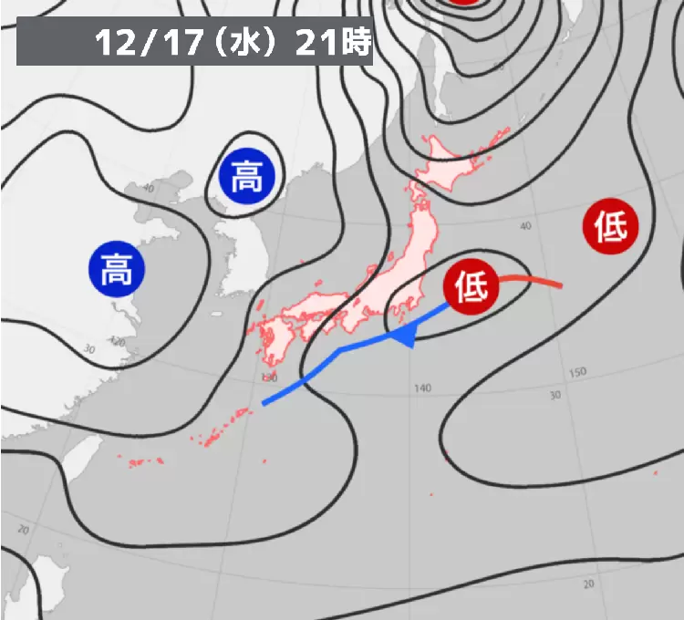 日本海に低気圧がある。低気圧の南西側には等圧線が低気圧側から凸になっている部分があり、その部分では天気図上には描かれていない前線がある。この部分が通過している東日本や西日本で雨が降っている。