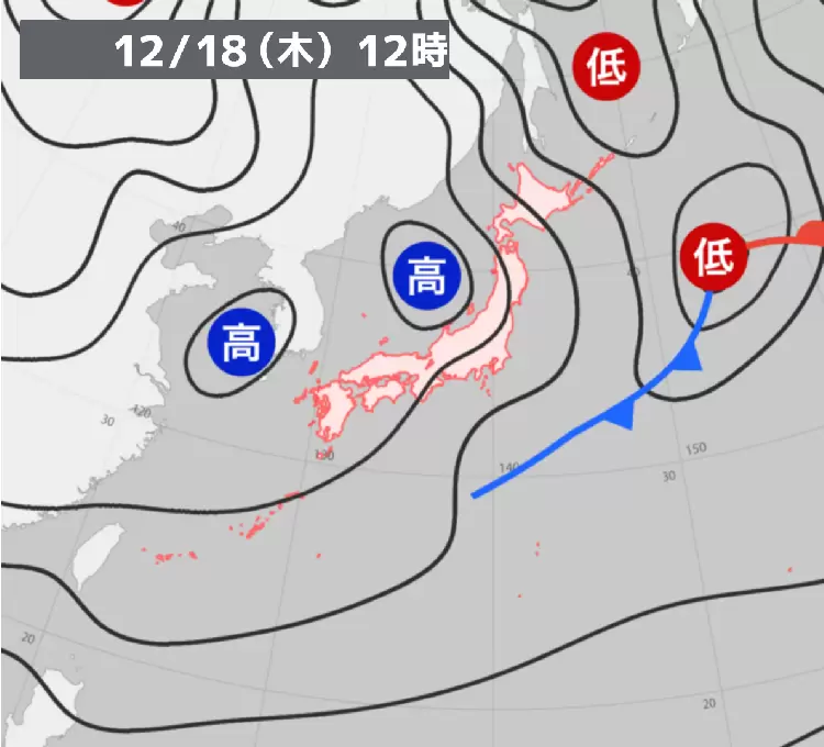日本付近は高気圧に覆われて、晴れているところが多くなっている。上空の寒気の影響で北日本日本海側では雪が降っているところがあるが、段々と止むエリアが増えてきている。