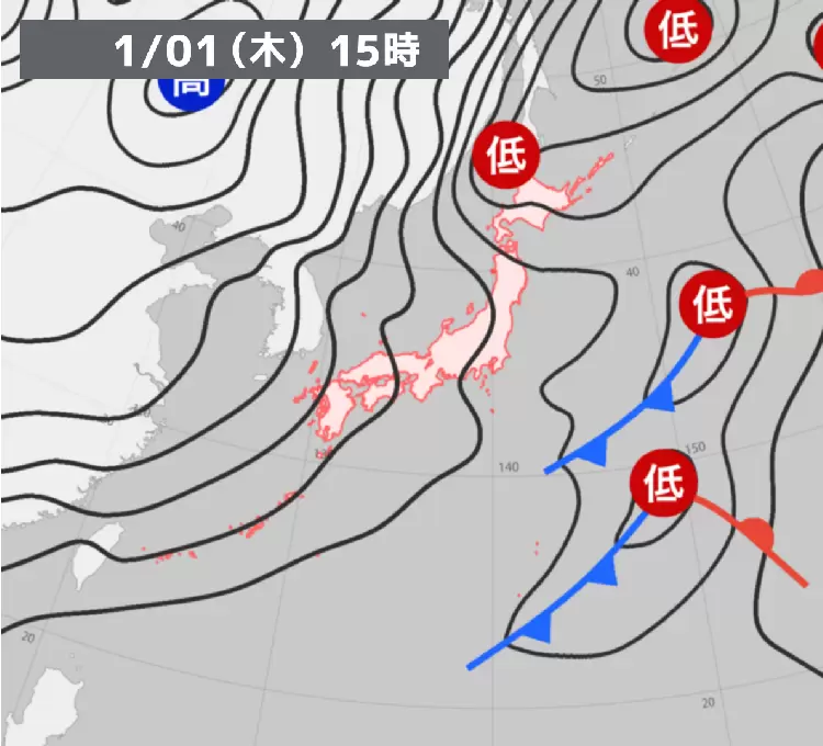 日本付近は冬型の気圧配置が強まっている。日本海側は雪や雨の降っている所が多く、局地的な強まりに注意が必要だ。特に、等圧線が凸になっている所にはJPCZ(日本海寒帯気団収束帯)が指向し、雷やアラレなどにも注意。一方、太平洋側は日差しの届いている所が多い。南西諸島には天気図に描かれない前線があり、所々で雨が降っている。