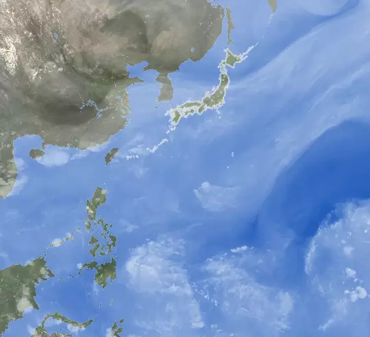 日本付近に見られる雲は低気圧や前線による雲。東北を中心に雨を降らせ、一部でやや強まっています。