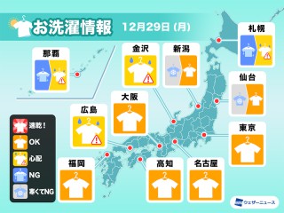 気温が低いため洗濯物の乾きが非常に遅く、凍結のリスクもあります。外干しは難しい予想です。