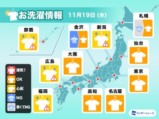 気温が低いため洗濯物の乾きが非常に遅く、凍結のリスクもあります。外干しは難しい予想です。