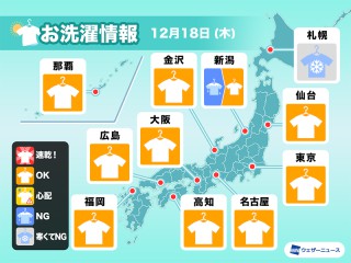 気温が低いため洗濯物の乾きが非常に遅く、凍結のリスクもあります。外干しは難しい予想です。