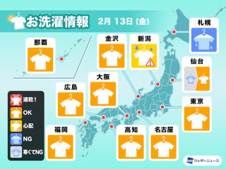 気温が低いため洗濯物の乾きが非常に遅く、凍結のリスクもあります。外干しは難しい予想です。
