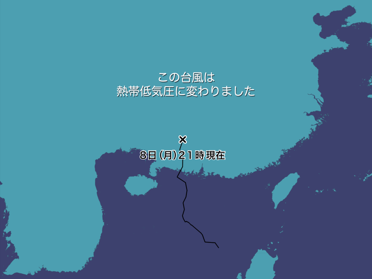 台風16号は、8日(月)21時に熱帯低気圧に変わりました。※「ターファー(Tapah)」はマレーシアが提案した名称で、ナマズ科の淡水魚の名前が由来です。