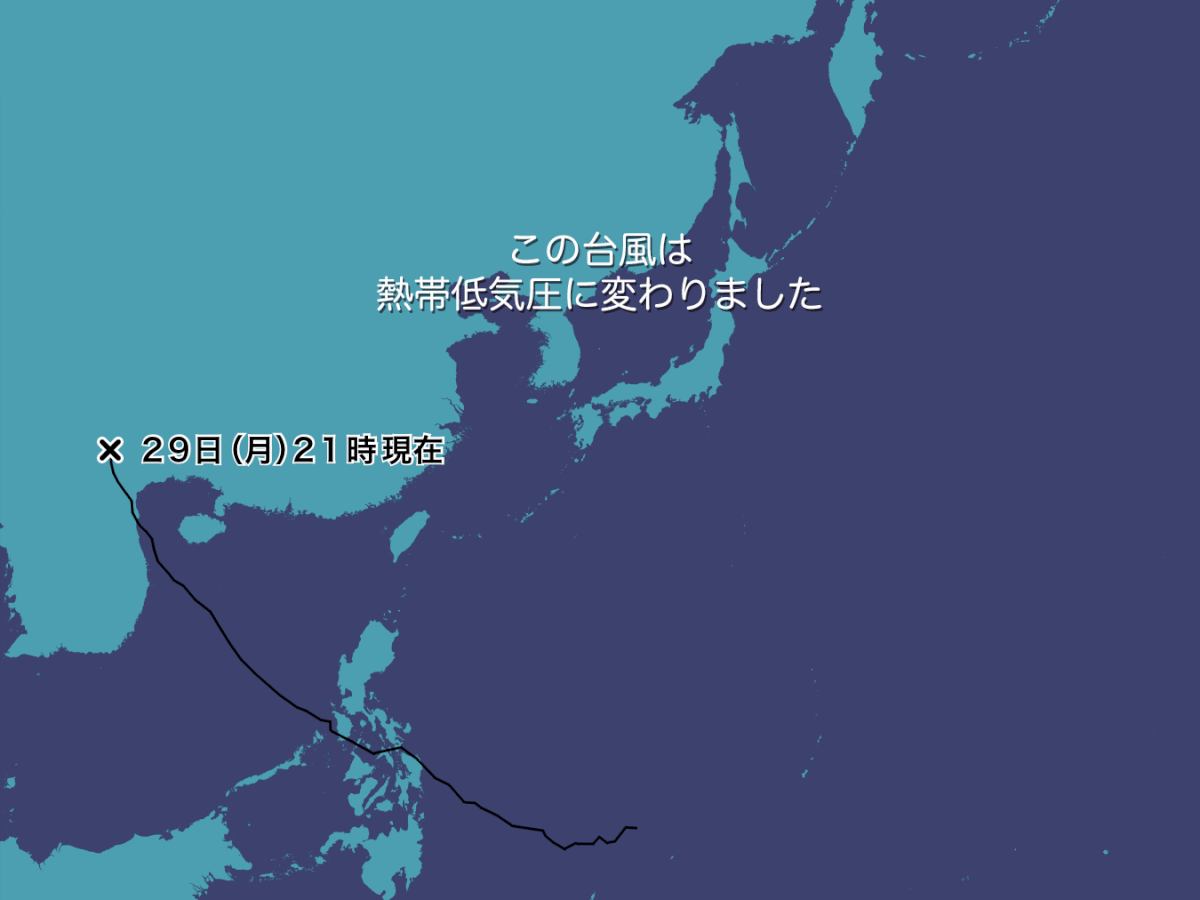 台風20号(ブアローイ)は、29日(月)21時にラオスで熱帯低気圧に変わりました。※「ブアローイ(Bualoi)」はタイが提案した名称で、タイのお菓子(デザート)の名前です。