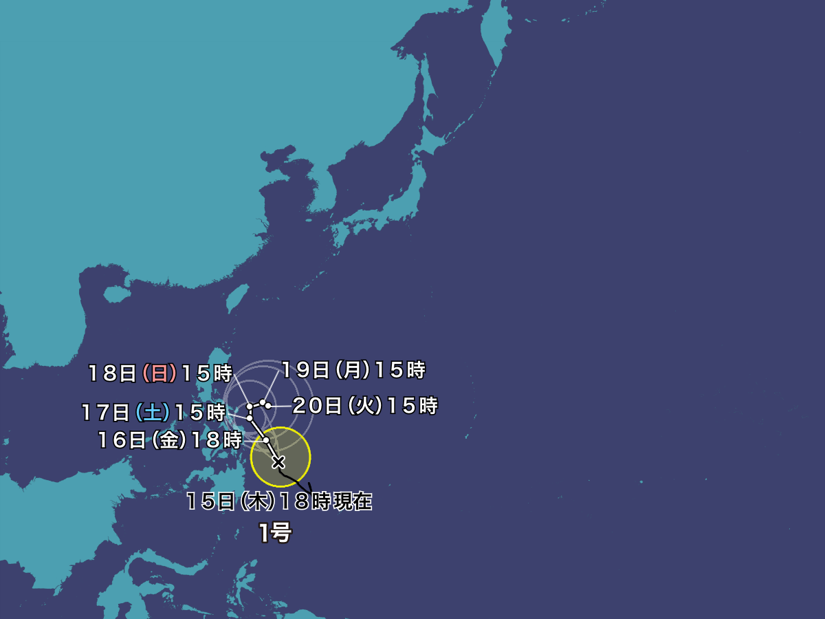 台風1号(ノケーン)はフィリピンの東にあって、北西に進んでいます。今後は北西に進みながら発達するとみられます。フィリピンには上陸せず、18日(日)以降は進路を北から東寄りに変える見込みです。 来週は寒波が襲来することで台風は北上しにくく、日本列島への影響はない予想です。 ※「ノケーン(Nokaen)」はラオスが提案した名称で、ツバメを意味する言葉です。