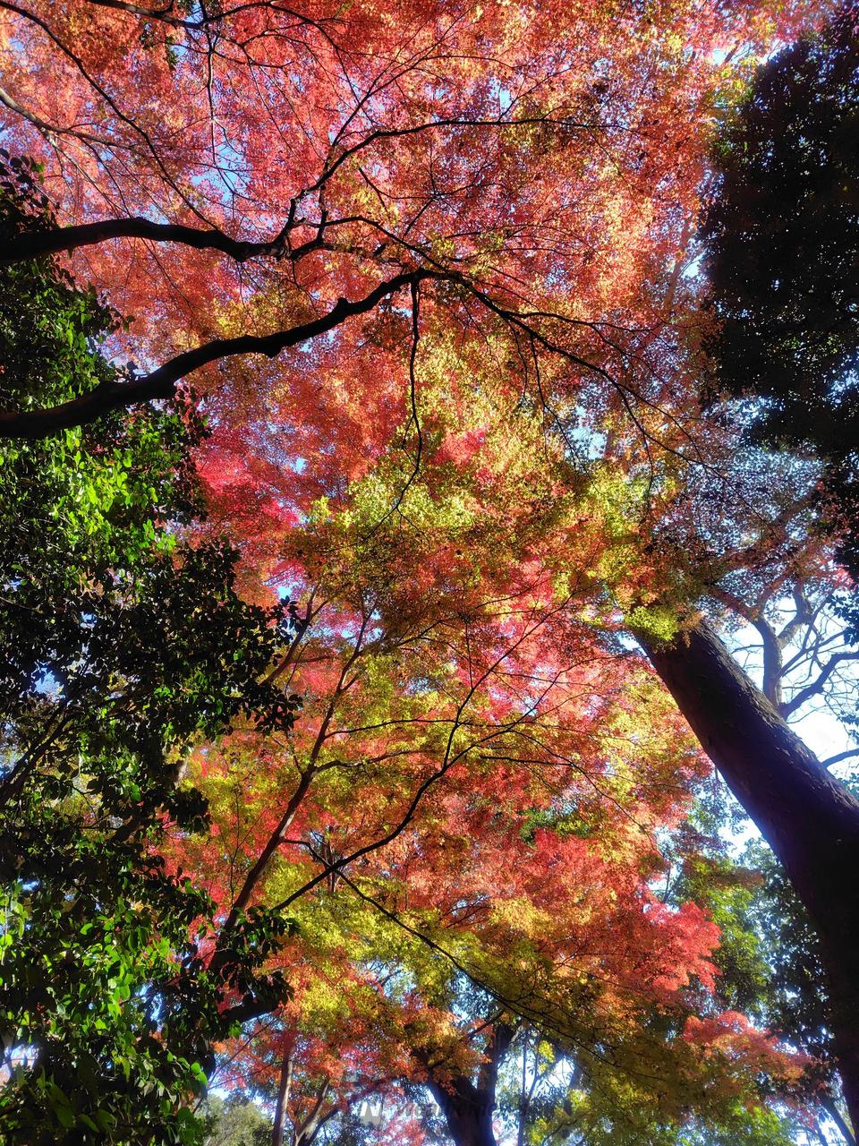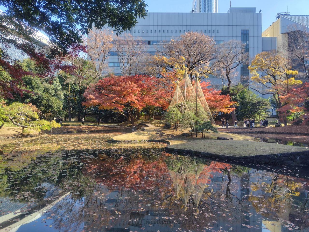 小石川後楽園の紅葉は、大泉水に浮かぶ蓬莱島のイロハモミジから始まります。見頃時期には、大泉水の傍の「紅葉林」が水面に映る様子や「丸屋」周辺の紅葉が天井のように空を覆う景色が美しいです。