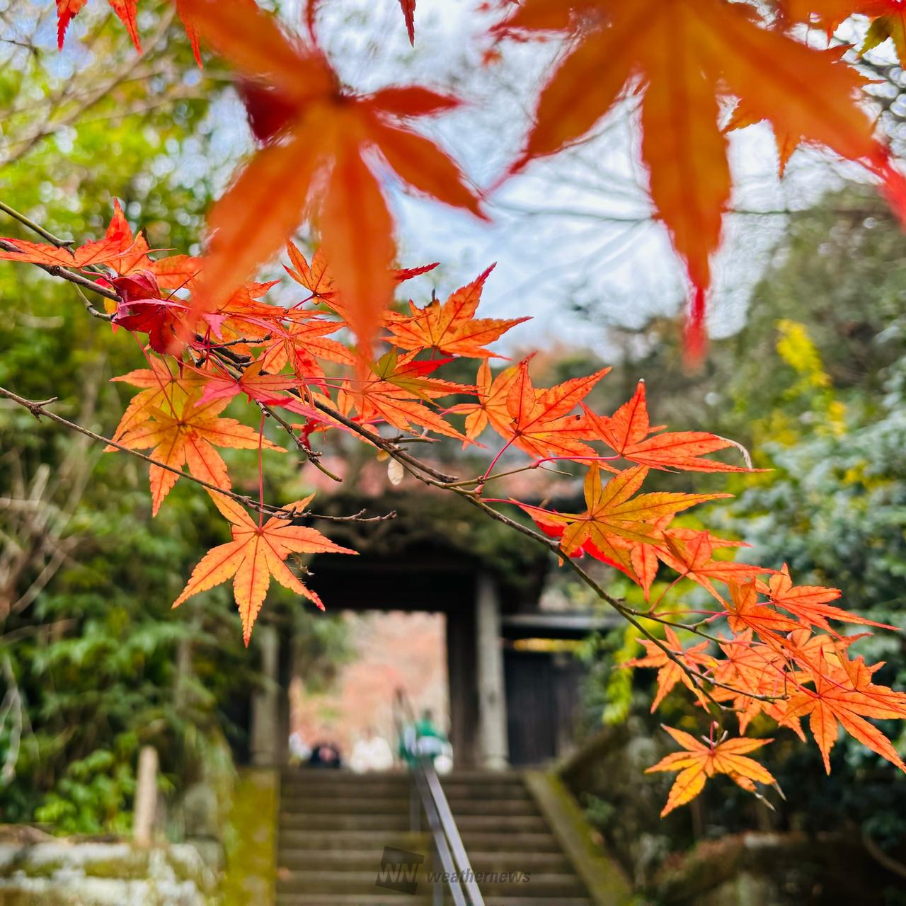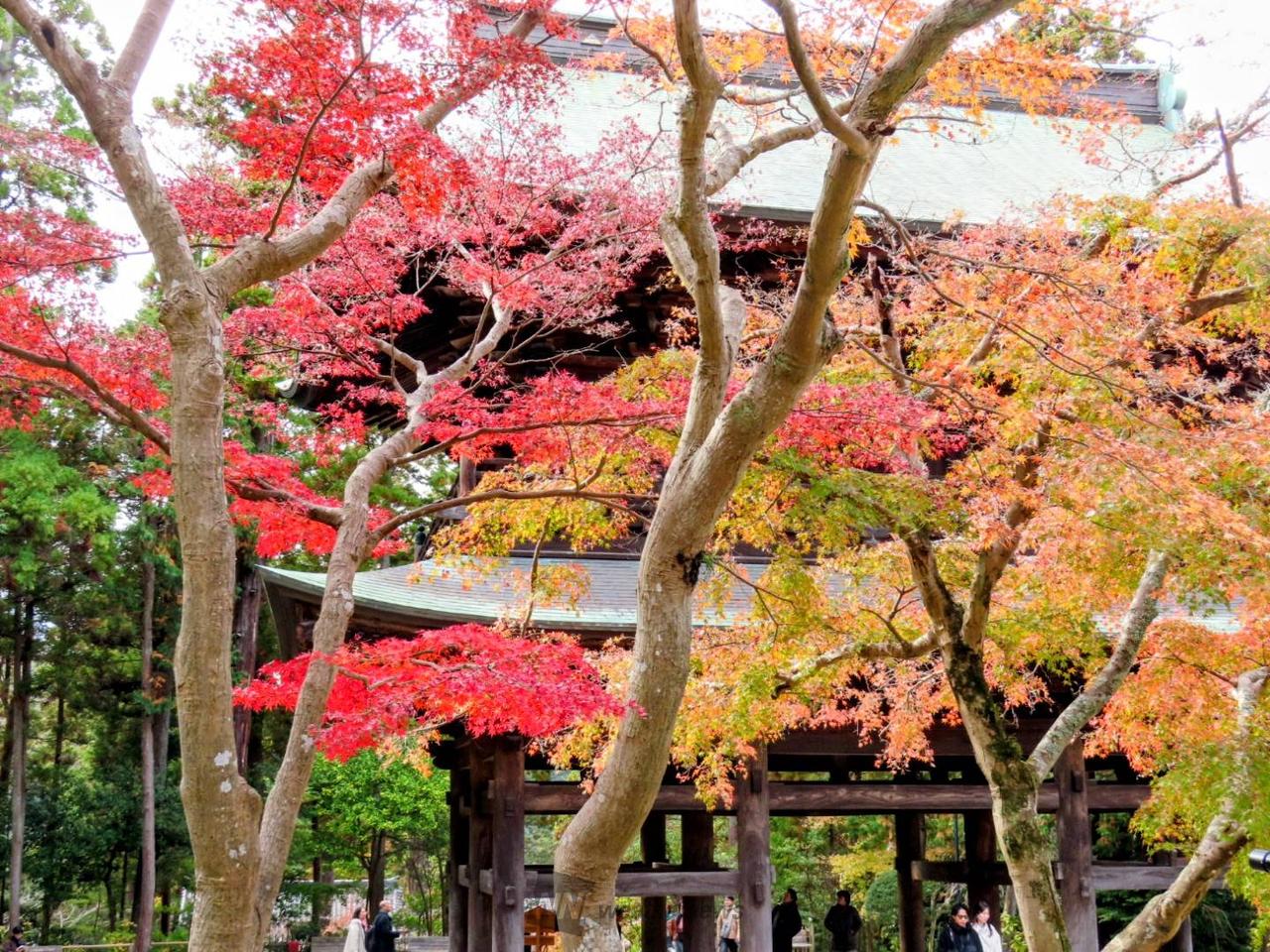 妙香池周辺、居士林前、山門周辺(モミジ)、総門奥参道(イチョウ)。緩やかに傾斜する境内参道に沿って色づく紅葉を奥行きのある景観の中でお楽しみいただけます。