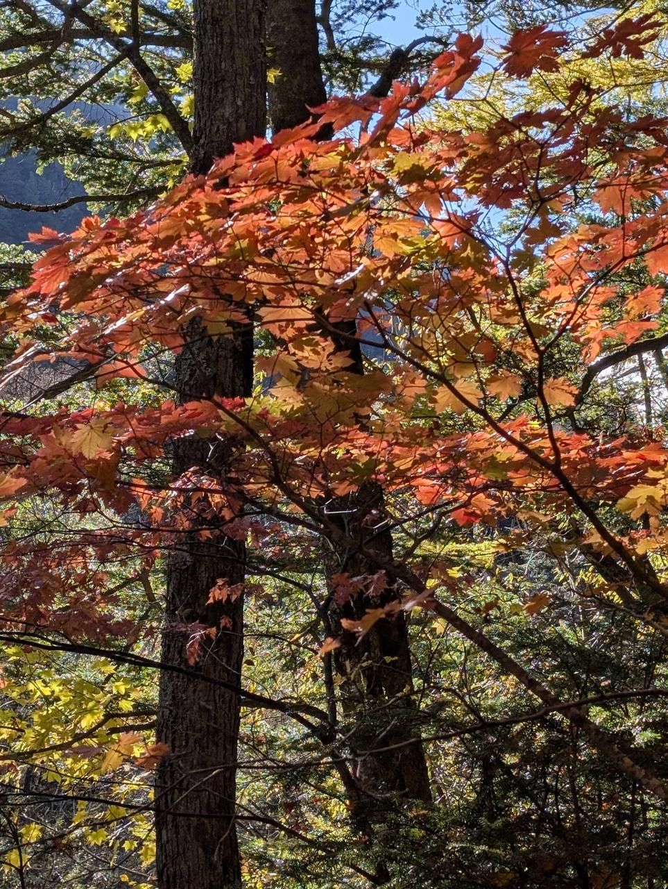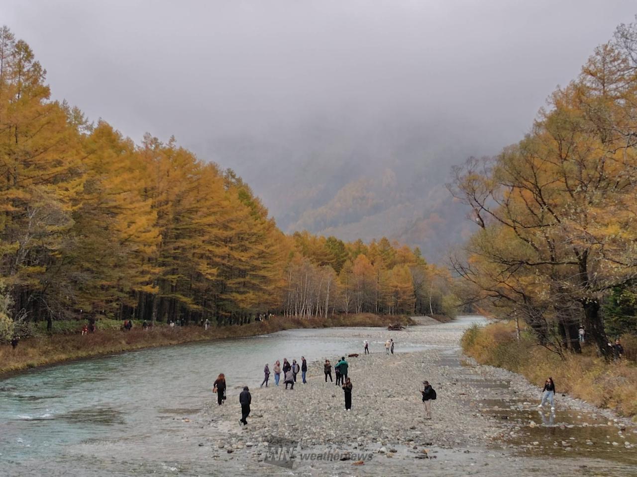 春、新緑に萌えたカラマツが上高地一帯で黄金色に染まります。新緑の頃とは違った雰囲気をかもし出す中で、紅く染まったコハウチワカエデが色どりを添えます。