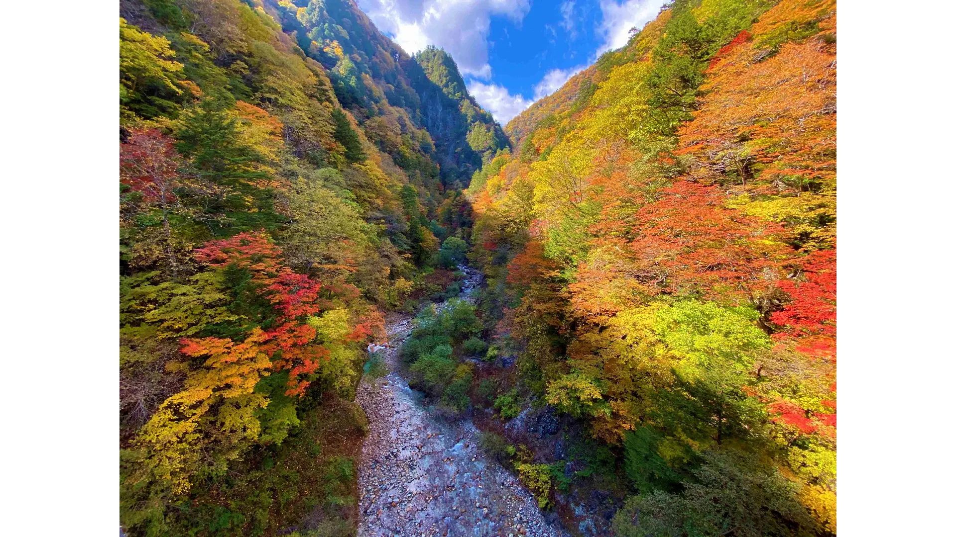 北葛沢(渓流と周辺の紅葉)、高瀬ダム湖や龍神湖(大町ダム湖)のエメラルドグリーンの湖面と周辺の紅葉