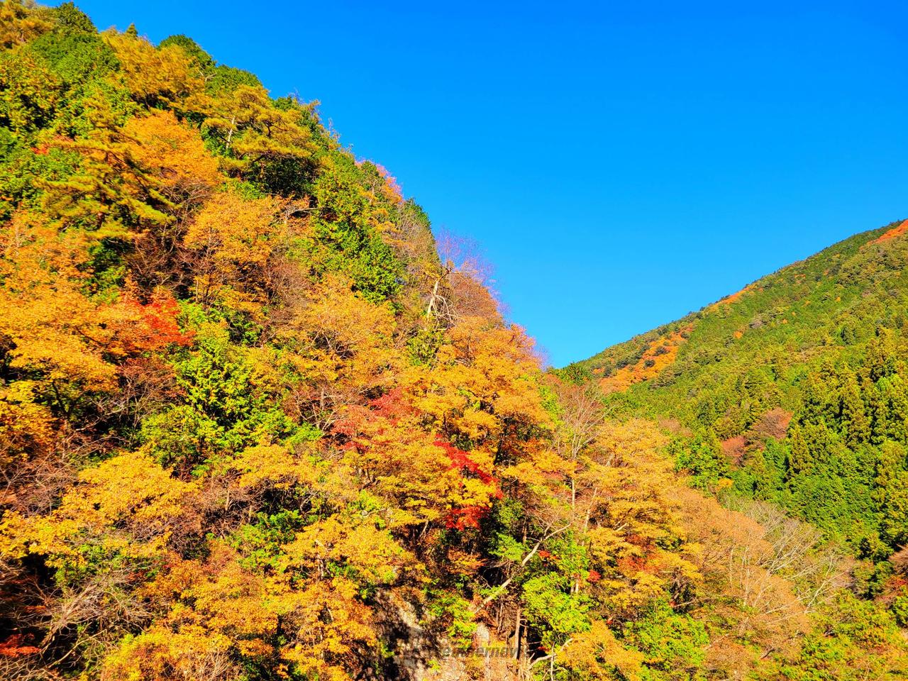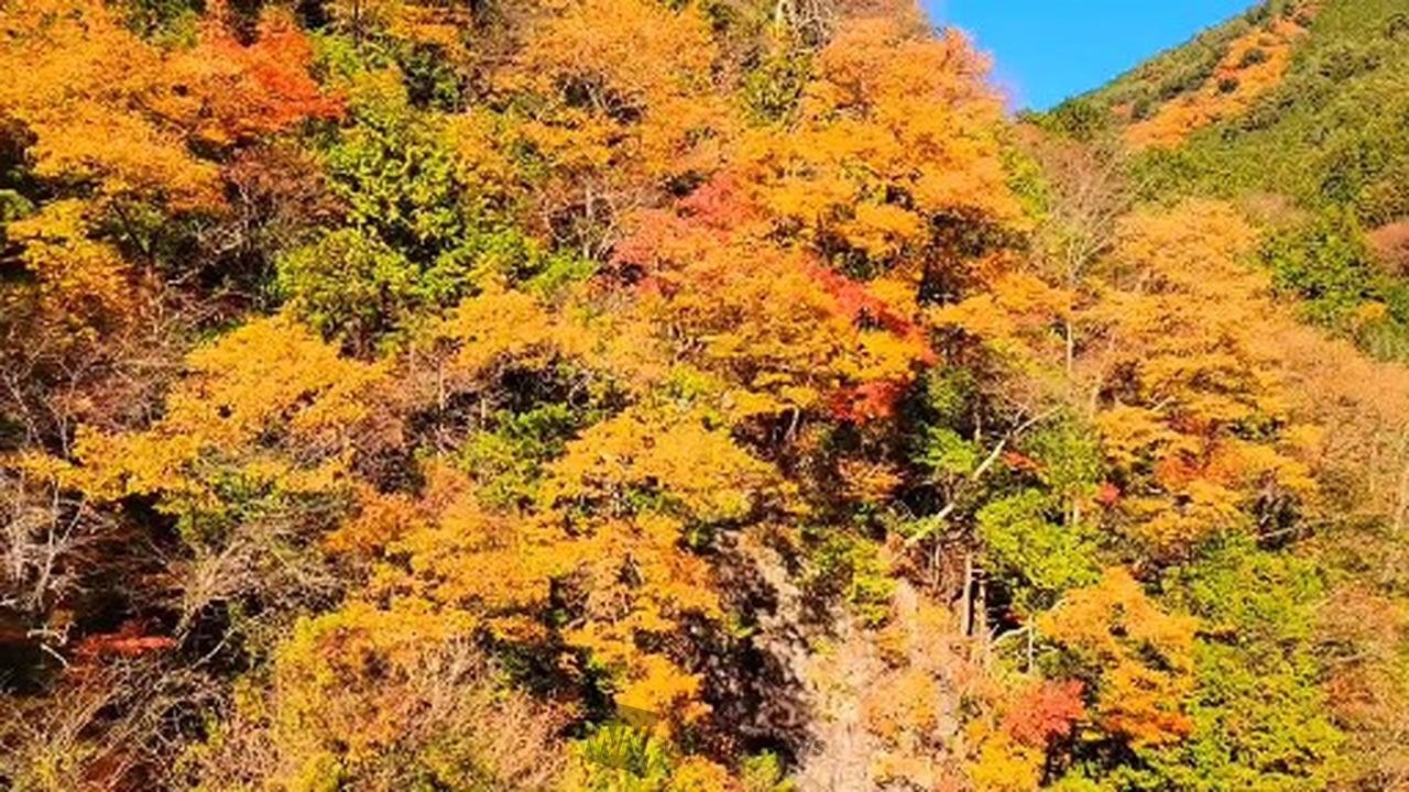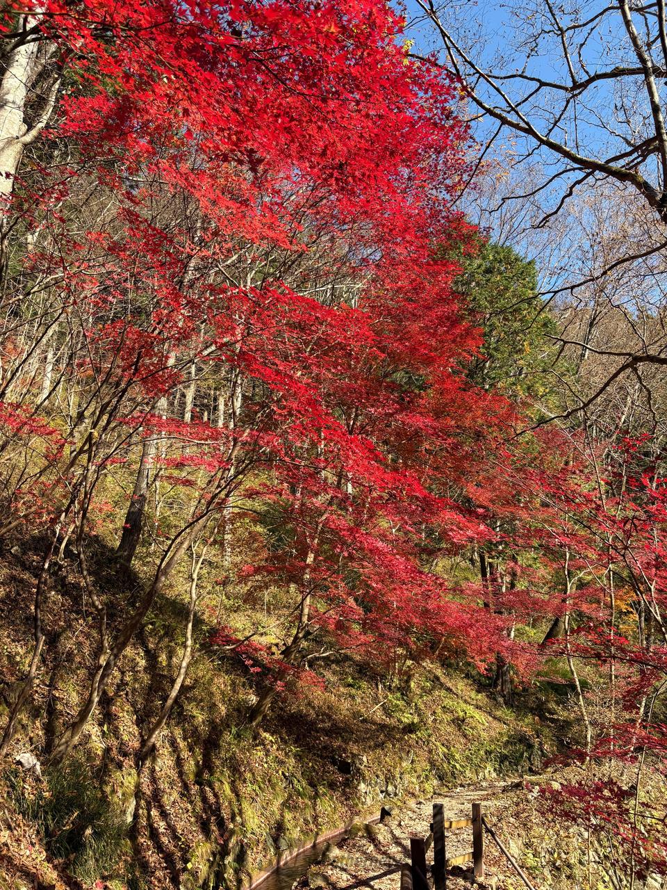 攻橋、本谷橋から見る紅葉は見ごたえあります。エメラルドグリーンに透き通る川と紅葉の見事なコントラストが最高です。不動公園のモミジの見頃は、少し遅いので11月中旬頃までご覧いただけます。