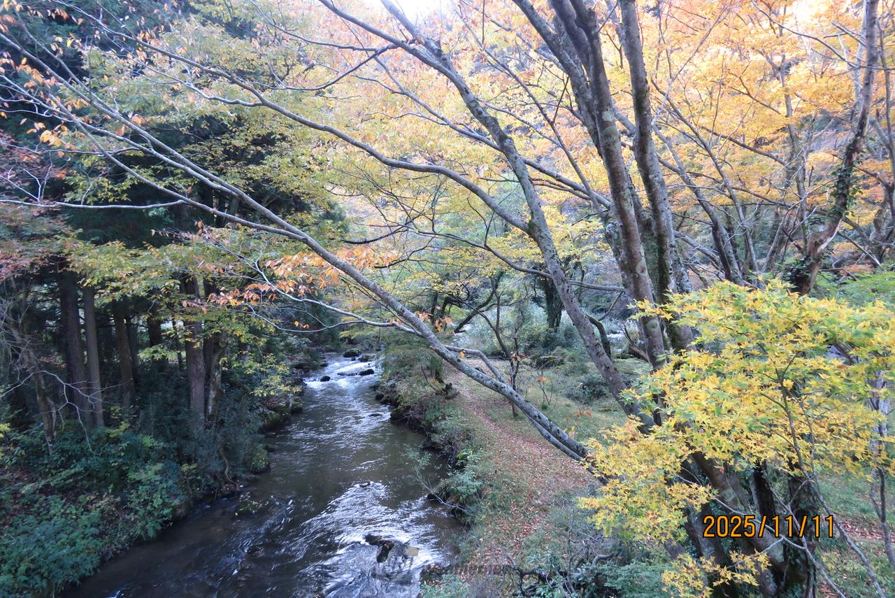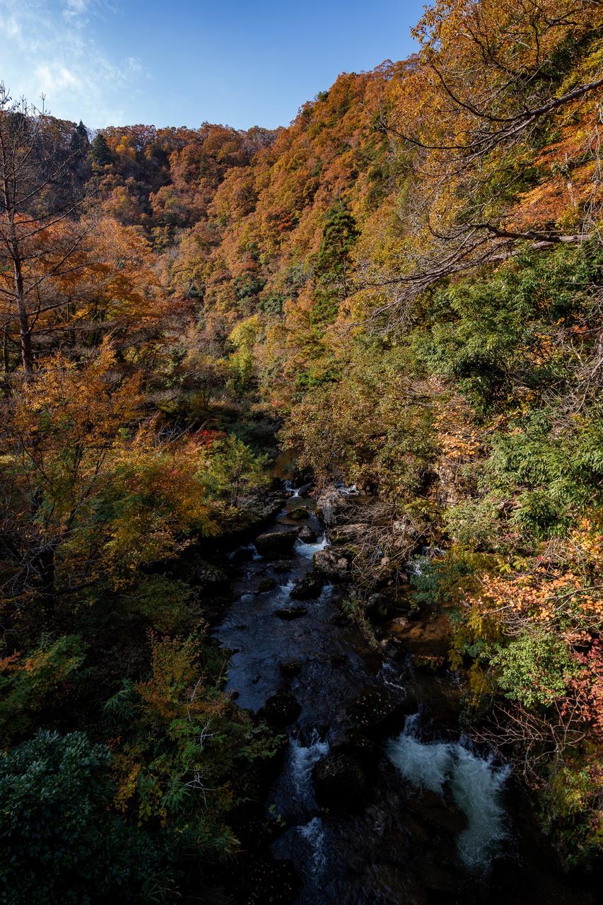 澄んだ流れが美しい渓谷で、加賀能登八風景の一つです。大杉谷川の中流で最も谷間の狭った所に位置し、清らかな川面に色鮮やかな紅葉が映え、幻想的な風景に包まれた絶景の景観地です。荒俣峡の遊歩道は、1周400m、冬期間は難所、遭難があり昭和15年に新道が新設され渓谷内の約100mの間に「杜鵑橋」、「保名橋」、「河鹿橋」があり中島に架かる橋が保名橋で紅葉の見所です。