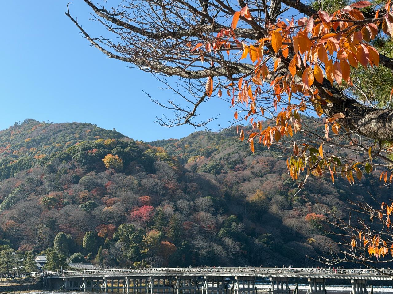 嵐山全域でモミジなどが紅葉し、山全体が赤や黄色に染まります。