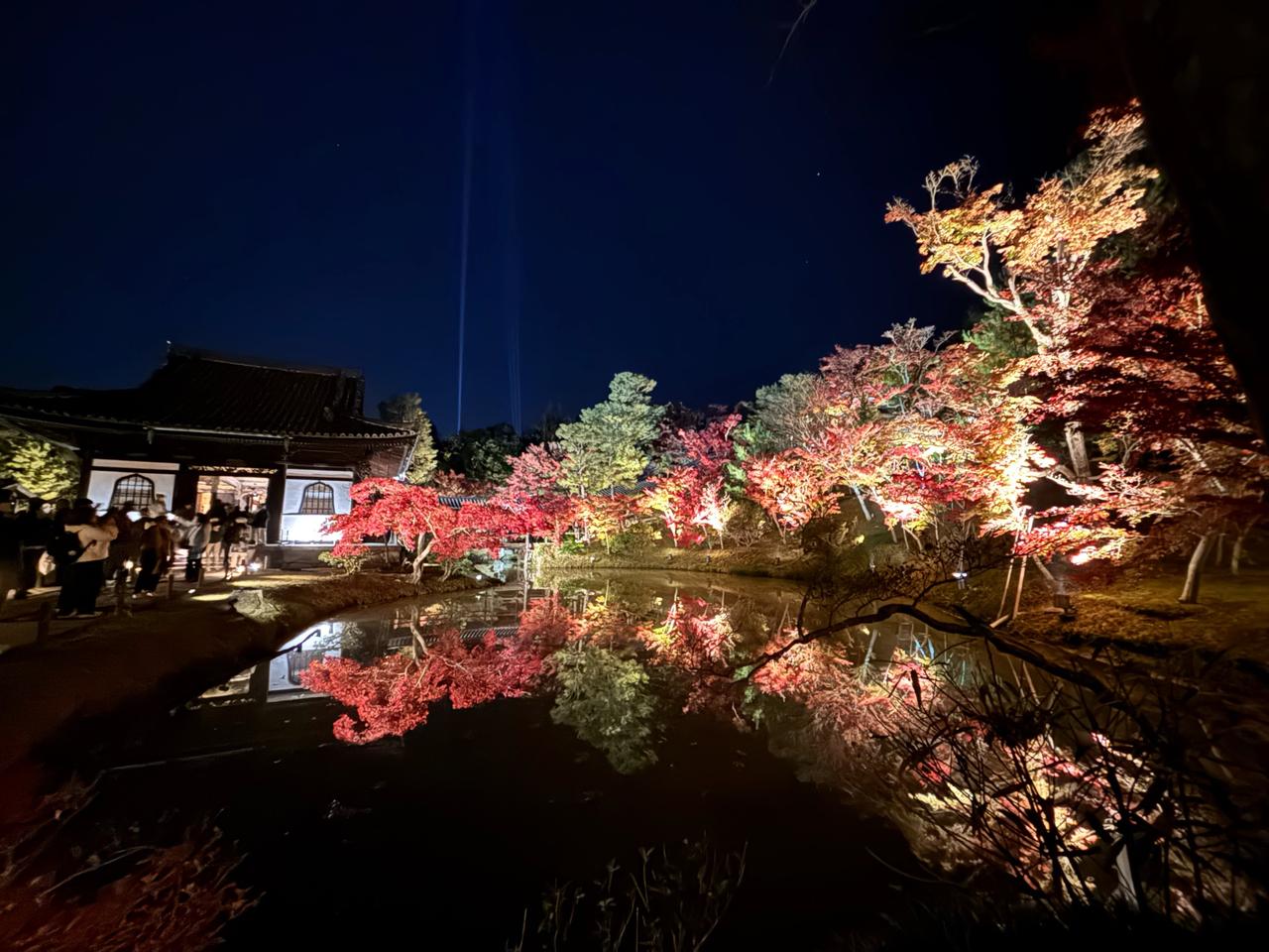 イロハモミジなど千本以上のモミジを境内で楽しめます。京都で初めてライトアップした寺院であり、紅葉のピーク時には小堀遠州作と伝わる「高台寺庭園(国指定 史跡名勝庭園)」にある鏡面のような臥龍池に映り込む風景は必見です。※ライトアップは境内での趣向をこらせた現像的な世界感をお楽しみ下さい。