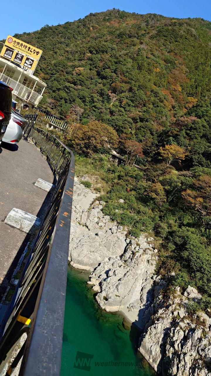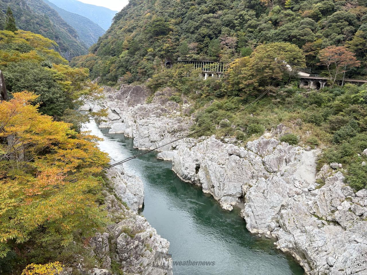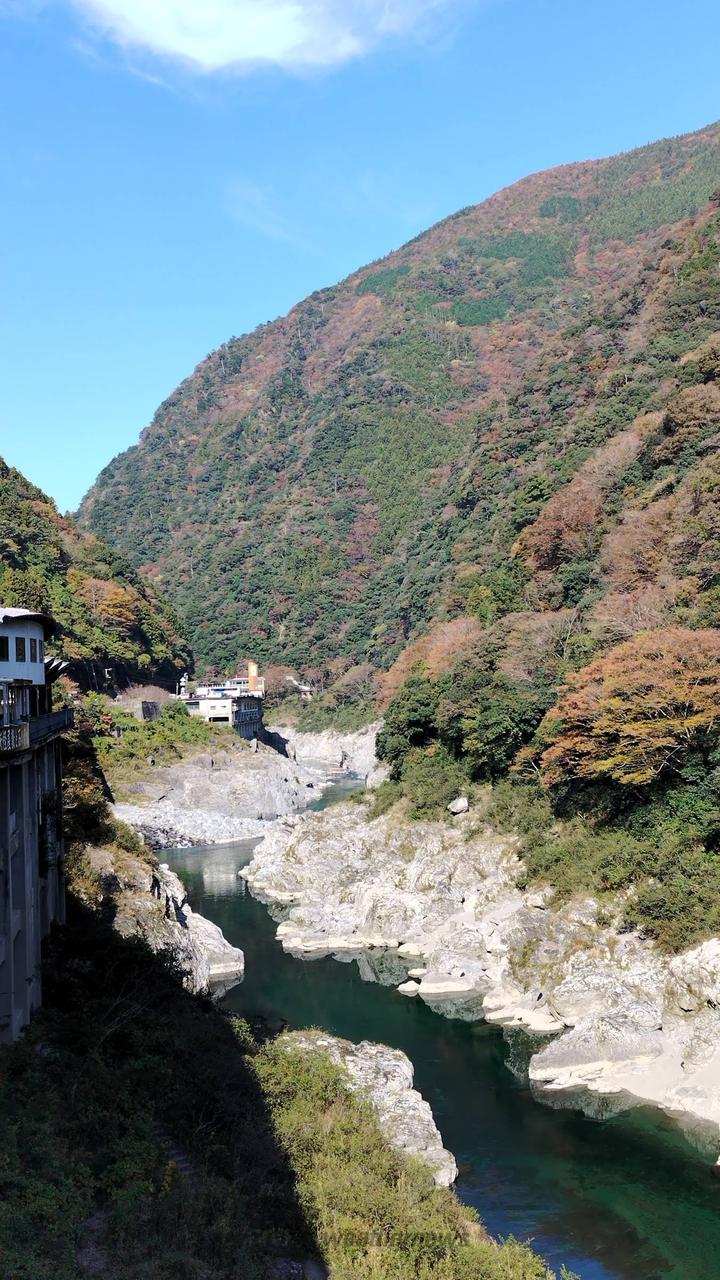 西日本随一の名勝、奇岩の景勝地、澄んだ水と切り立った岩肌、紅葉のコントラストが美しいです。V字型に切り立った渓谷の谷底から遊覧船に乗って船下りしながら眺める紅葉も絶景。鉄道の車窓から眺めるのもよし、国道沿いに設置された歩道をゆっくりウォーキングするのもよし。