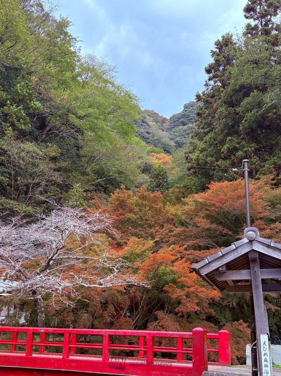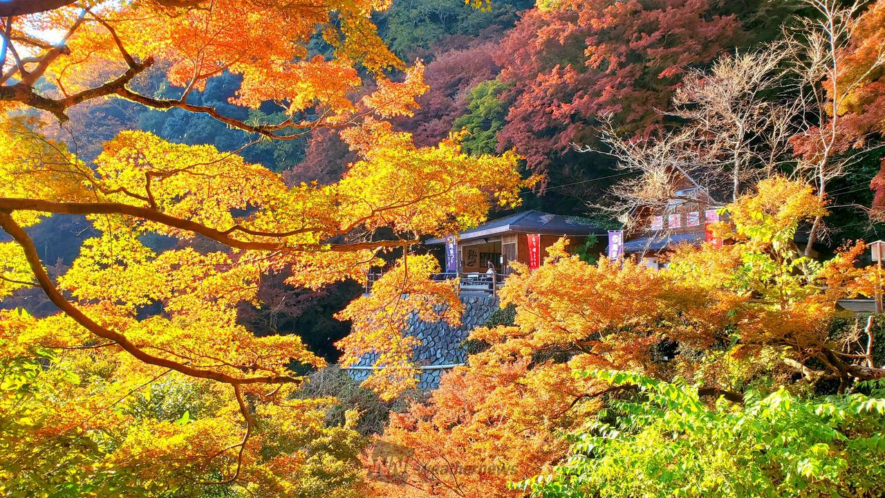 JR伊予白滝駅より徒歩10分、肱川河口から約6km上流に位置しています。もみじと滝のコントラストが美しく高さ60mから垂直に滝壺に落下するその景観は壮絶華麗を極めます。