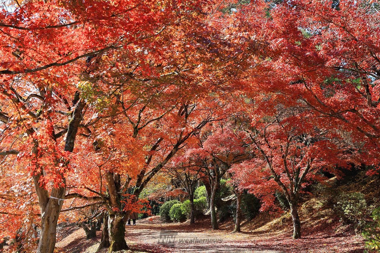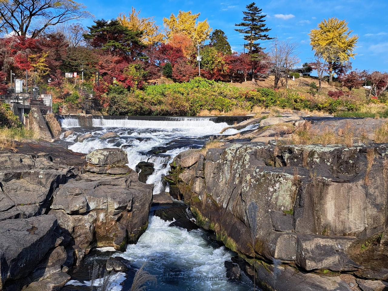 モミジ約400本、イチョウ約50本。滝幅210m、高さ12mの壮大なスケールを誇り、別名「東洋のナイアガラ」とも呼ばれる曽木の滝。豪快な滝の白い水しぶきに映し出されるモミジやイチョウは、その彩りを一層艶やかにしてくれます。公園内には食事のできるお店や土産品店などがあります。
