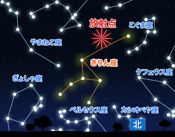 予想されている放射点は、北の空に昇るきりん座の側にあります。きりん座は暗い星が多く見つけにくいので、こぐま座の北極星を目印にして放射点を探すのがオススメです。 放射点付近を中心に空全体を眺めるようにして流星観測をお楽しみください。