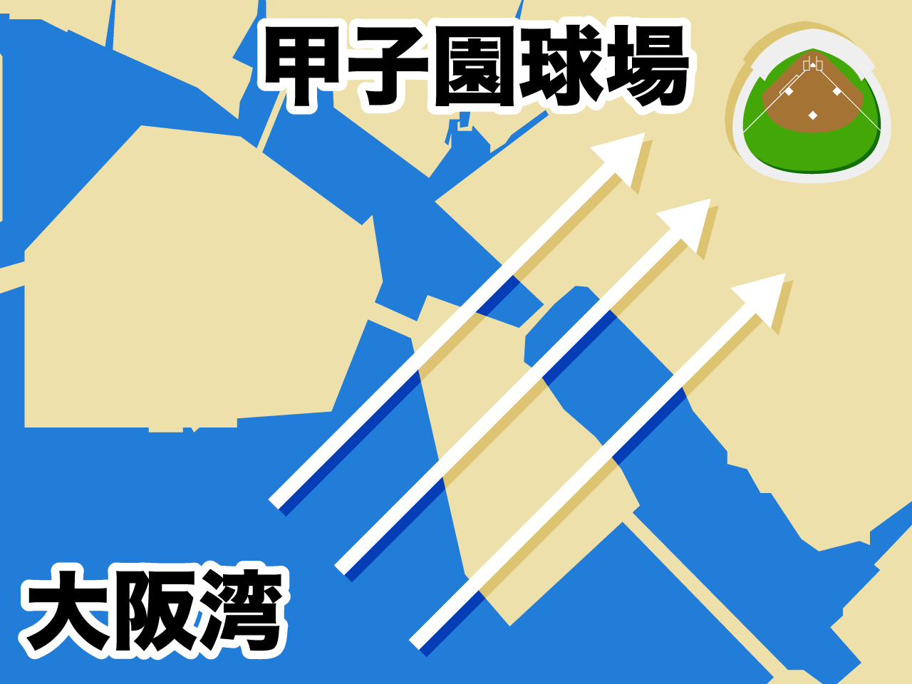 甲子園球場では、大阪湾から吹く南西よりの風を浜風と呼びます。特に夏は浜風が強く吹いて、試合の打球に影響することがあります。
