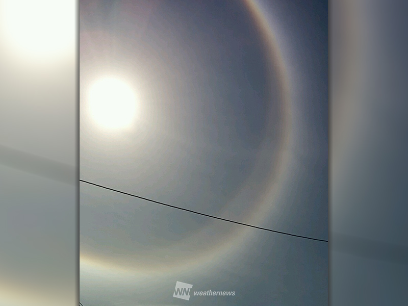 これは”外接ハロ”と呼ばれ、太陽の上下に現れるタンジェントアークが太陽高度が高くなることで変形したものです。