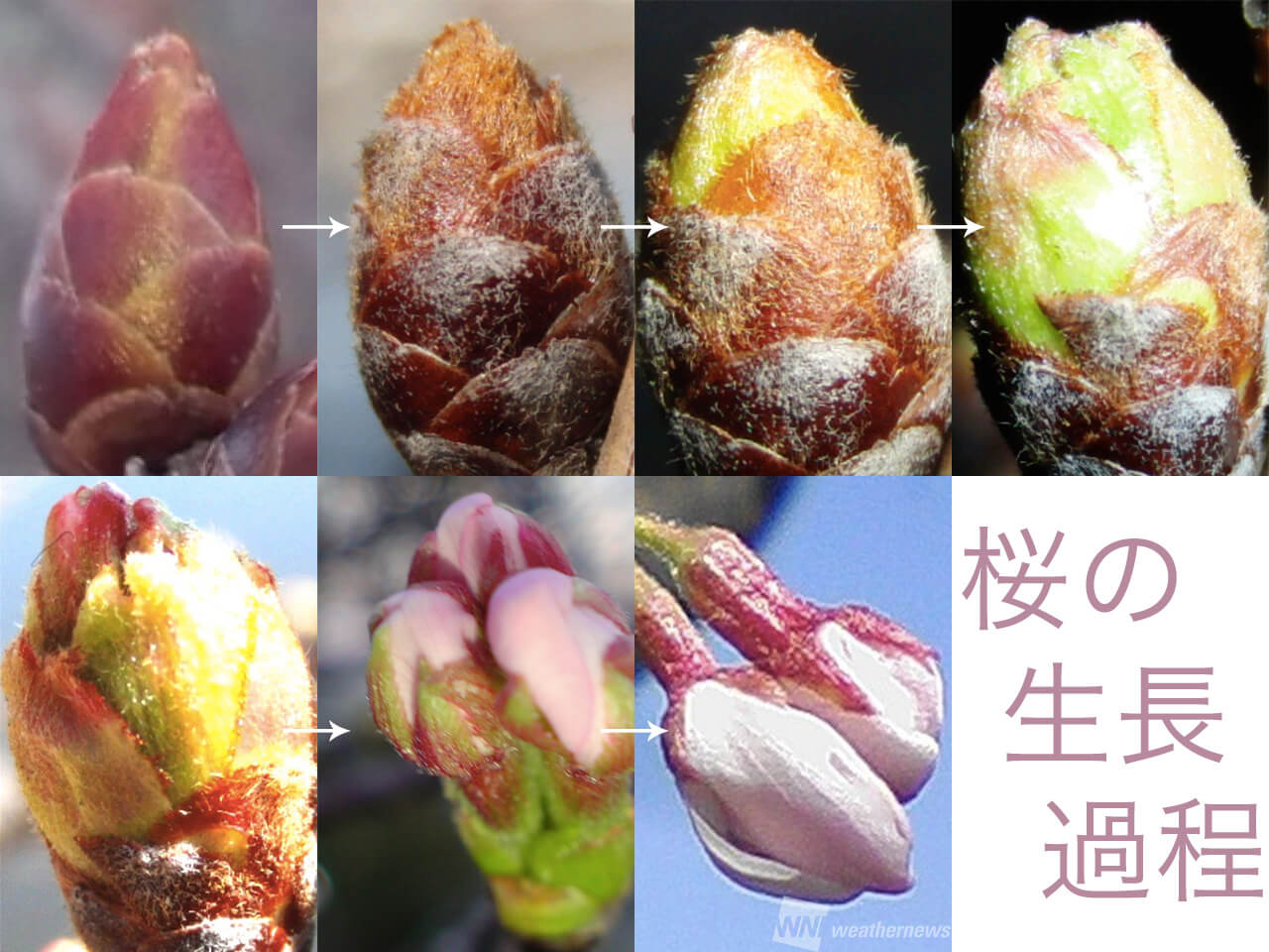 桜は、(1)まだ小さく硬いつぼみ=茶色→(2)先が黄色→(3)先が緑→(4)半分以上緑→(5)先がピンクに→(6)花びらが見えた→(7)花の軸が伸びきったの順に生長します。その後、およそ1日以内に開花し、満開へと向かっていきます。