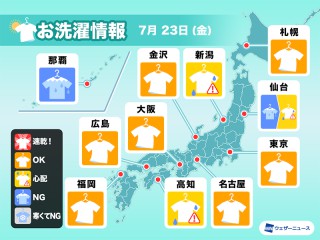関東以西では35℃を超える猛暑日の所があります。大阪市は35℃の予想で、東京都心も32℃まで上がる見込みです。