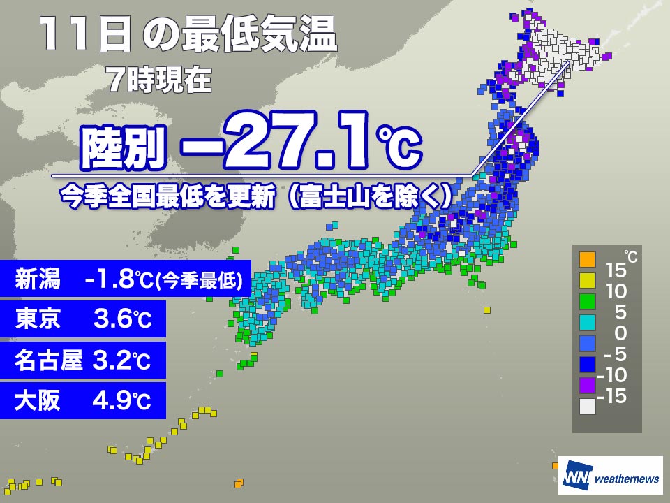 富士山を除く全国で最も冷え込んだのは北海道のアメダス陸別で、最低気温は−27.1℃でした。昨年8月1日以降に観測された今季の全国最低気温を更新しています。