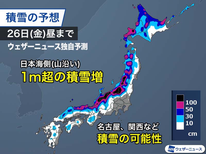 これから26日(金)朝までの積雪増加量は、最も多くなる北陸の山沿いなどは1mを超える所があるとみられます。北海道や東北から北陸、近畿北部から山陰の山沿いでは広い範囲で50cm以上に達し、各地で今季一番の大雪になる予想です。