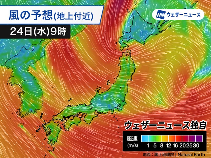 冬型の気圧配置が強まって東西の気圧差が大きくなるため、全国の広い範囲で強い風が吹き荒れます。