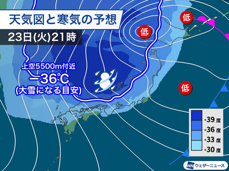 上空5500m付近で−36℃以下の、大雪をもたらすクラスの寒気が今夜になると山陰から北陸付近まで南下する予想となっています。寒気の南下に伴って大気の状態が不安定になり、日本海側の雪雲がより発達しやすくなる見込みです。