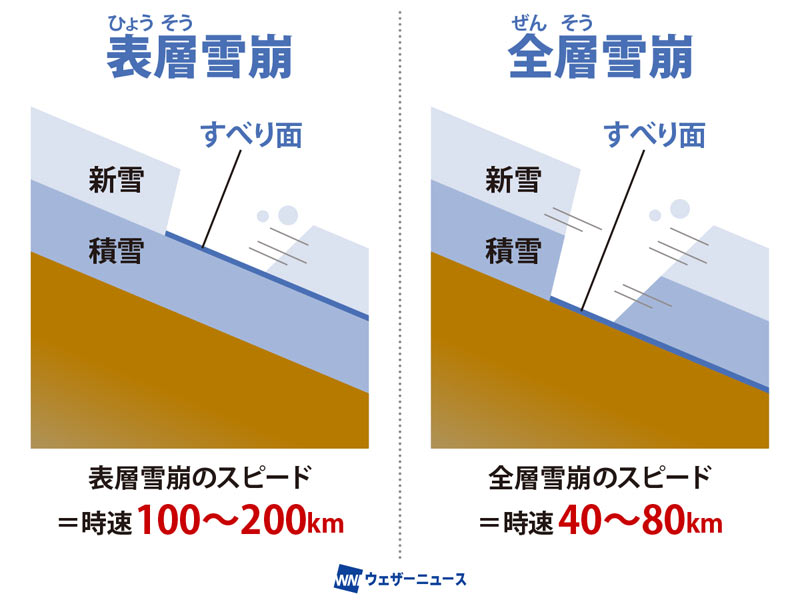 全層雪崩は気温が上昇する春先やフェーン現象の際、暖気によって積雪が溶けて深さが急に減少した際に発生しやすく、雨が降った後も発生の可能性が高まります。
