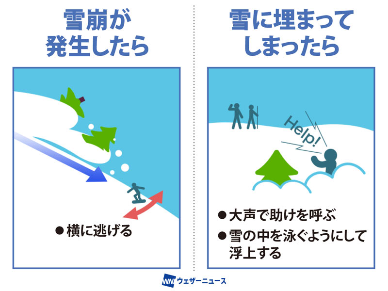 雪に埋まってしまったら、埋まった場所を他の人に見つけてもらうことが最も大切ですので、大声で助けを呼んでください。また、雪が止まりそうになったタイミングで、呼吸が確保できるよう、手で口の回りを覆って空間を作ってください。さらに雪の中を泳ぐようにして浮上するように努めてください。他の人が流されている場面に遭遇したら