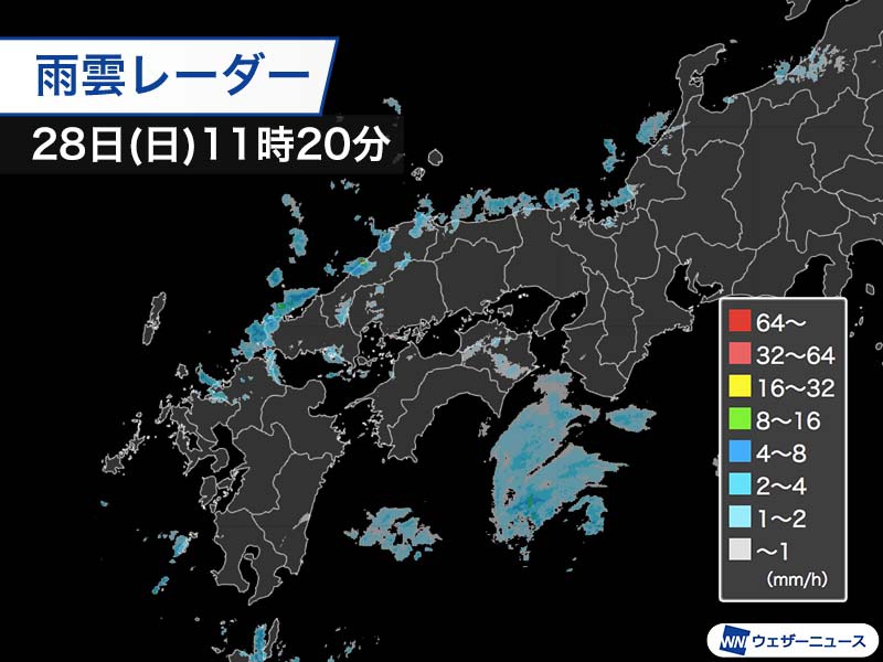 九州北部から中国地方にはやや活発な雨雲がみられ、11時20分までの1時間には島根県松江市・鹿島で3.0mm、福岡県福岡市・早良脇山で2.5mmの雨を観測しました。福岡県内の一部では霰の降った所もあります。