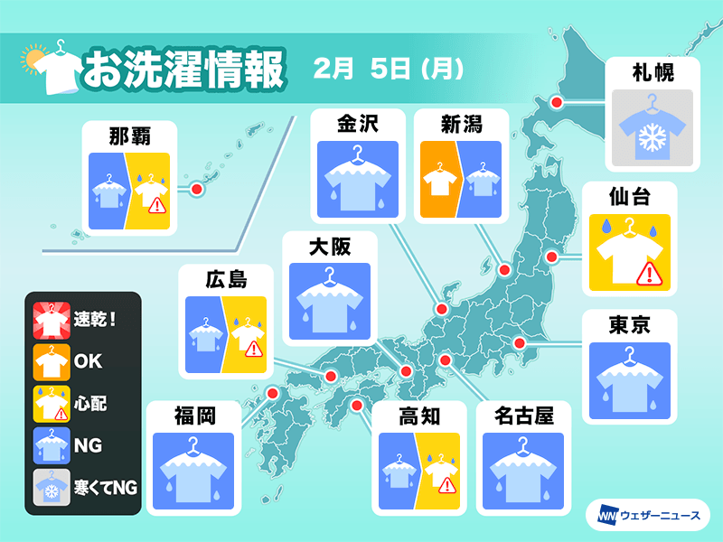 今日5日(月)は、低気圧や前線が通過する影響で広く雨や雪が降り、外干しNGの空となります。関東は、午前中は雨や雪が降っていなくても段々と雪が降り出すので、外干しは避けてください。